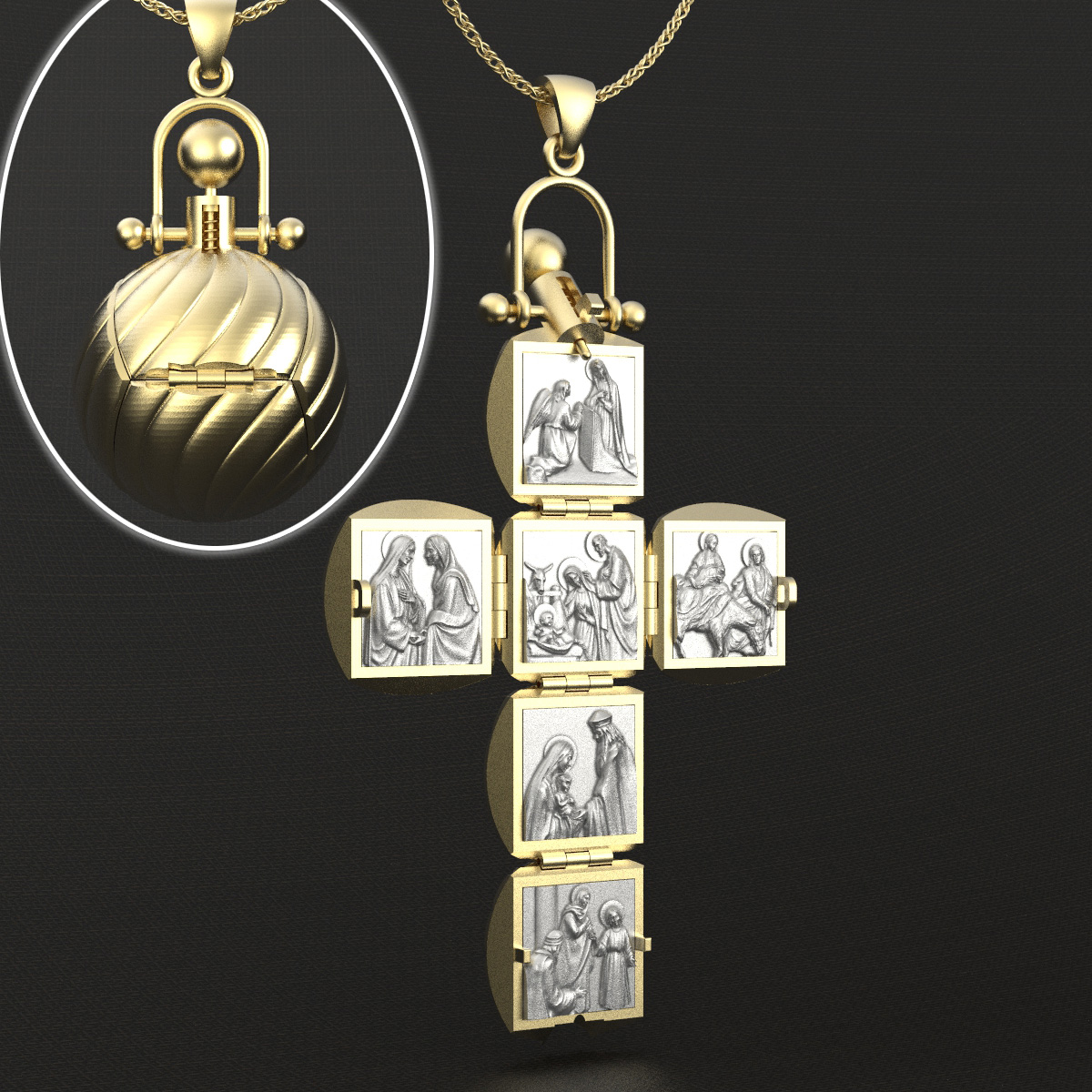 2025年圣诞纪念款 耶稣诞生 变形吊坠十字架 折叠起来 是一个直径3cm的黄铜圣诞啊彩球 加挂环长度6cm 拉开弹簧卡扣, 展开是6*8cm的十字架 加挂环长度11cm 里面镶嵌六幅925银质浮雕 为小耶稣的生平